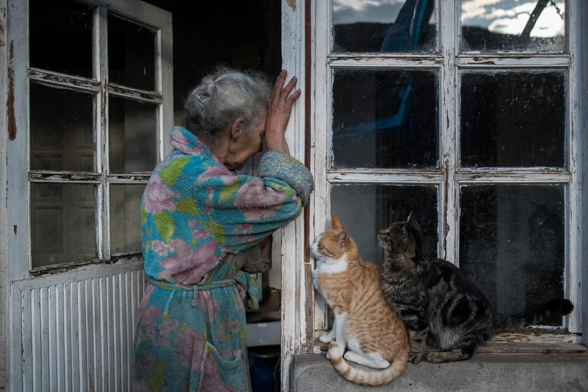 Abovyan Hasmik (69 éves) sír az otthona ajtajában a hegyi-karabahi Nerkin Sus faluban, november 30-án.